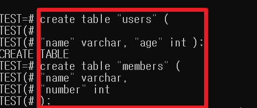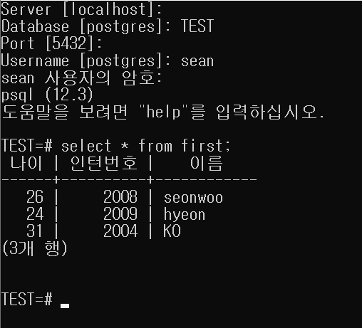 'psql'을 실행시키면 이렇게 검은 화면의 SQL Shell이 열립니다.