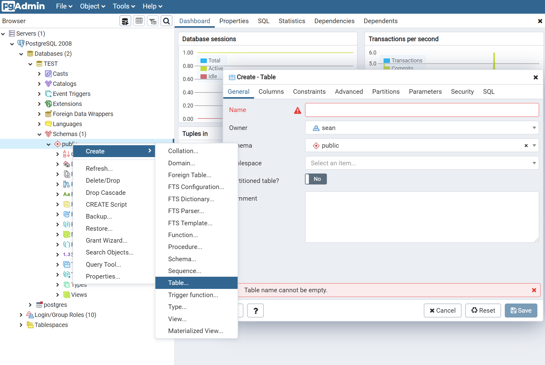 'Schemas' -> 'public'에서 테이블을 만들고 확인 할 수 있습니다.