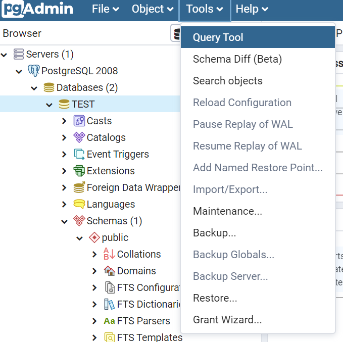 ☞ 이제는 'Query Tool'을 사용해 볼텐데요, 상단에 'Tools' -> 'Query Tool'에 있습니다.