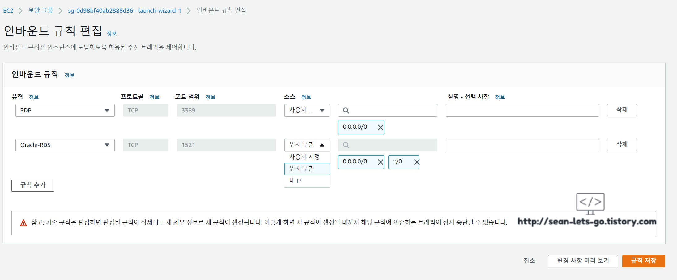 - AWS EC2 WEB에서도 인바운드 규칙(1521) 설정 해주셔야 합니다.