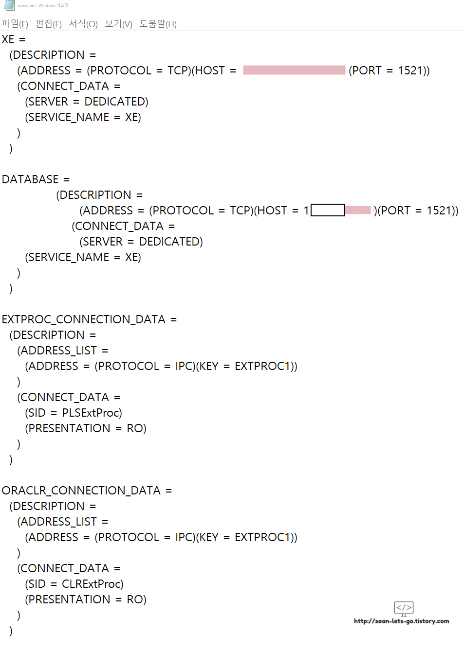 - local에서 tnsnames.ora 을 메모장으로 열어준뒤, 두번째 단락('DATABASE=' 요 부분)을 타이핑 해서 추가해줍니다. → HOST는 EC2 윈도우 IP 입니다.