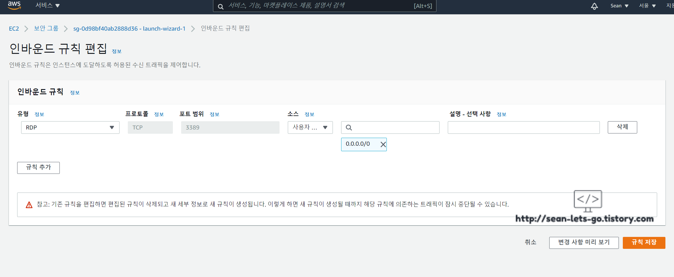 - EC2 → 보안그룹 → 인바운드 규칙 편집에서, 규칙을 추가해줍니다.