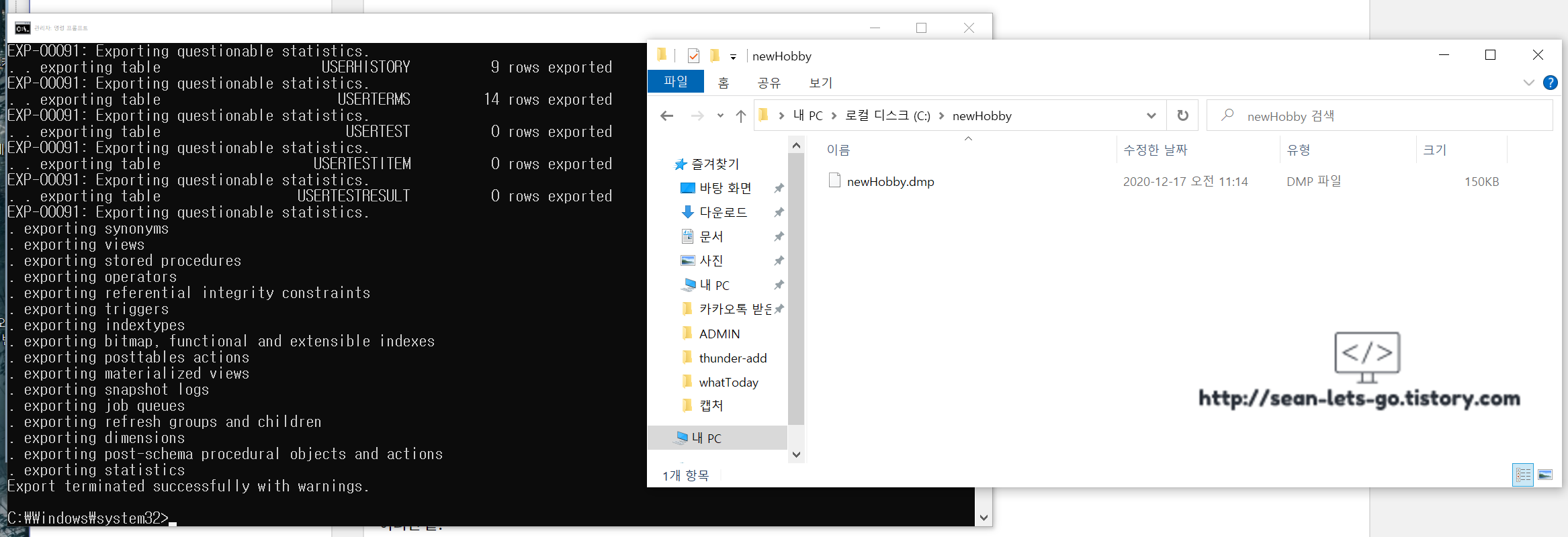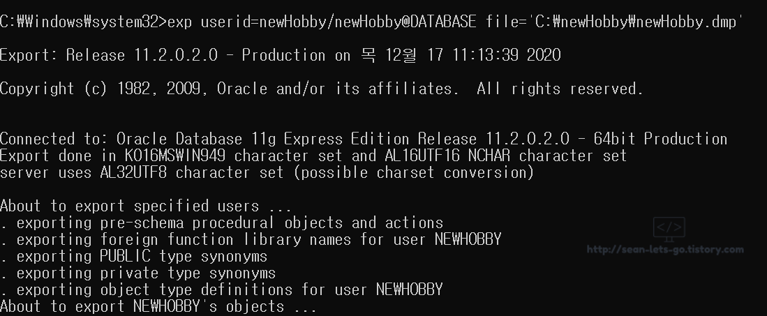 - exp userid=newHobby/newHobby@DATABASE file='C:\newHobby\newHobby.dmp'