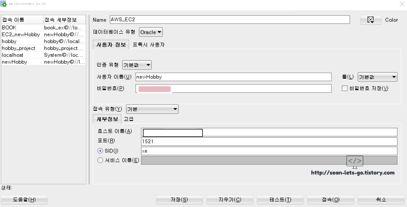 첫 포스팅은 참고하세요~! https://sean-lets-go.tistory.com/15?category=868474 AWS EC2 WINDOW 사용해서 프로젝트 외부 Oracle DataBase 만들기(1) 팀 프로젝트를 하고 있다가, 외부(공용) DataBase 를 사용해..
