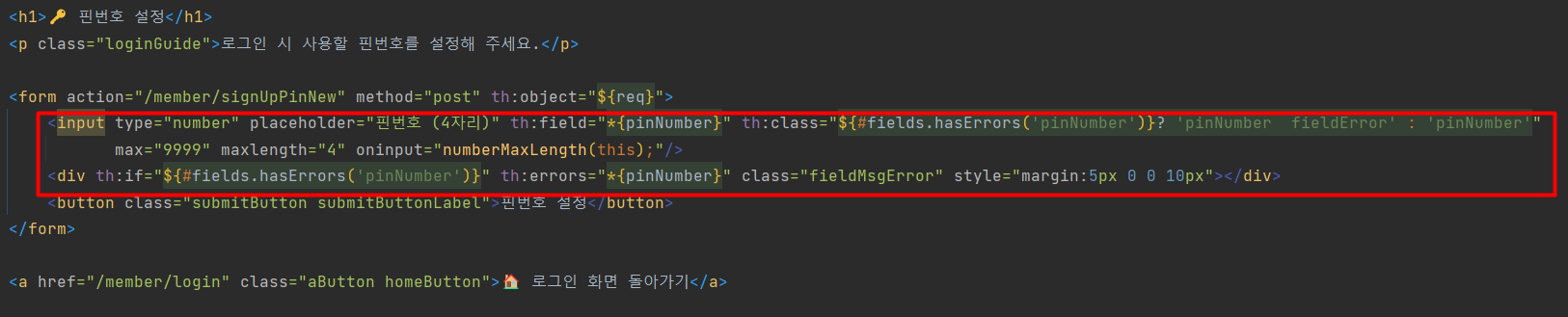 <input type="number" placeholder="핀번호 (4자리)" th:field="*{pinNumber}" th:class="${#fields.hasErrors('pinNumber')}? 'pinNumber fieldError' : 'pinNumber'"