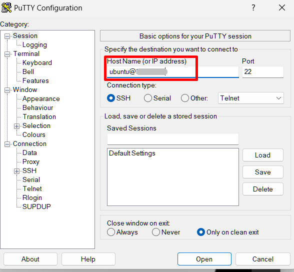 Host Name 입력 할 때, IP주소 앞에 'ubuntu@'를 붙여줘야 로그인 화면이 뜨지 않습니다.