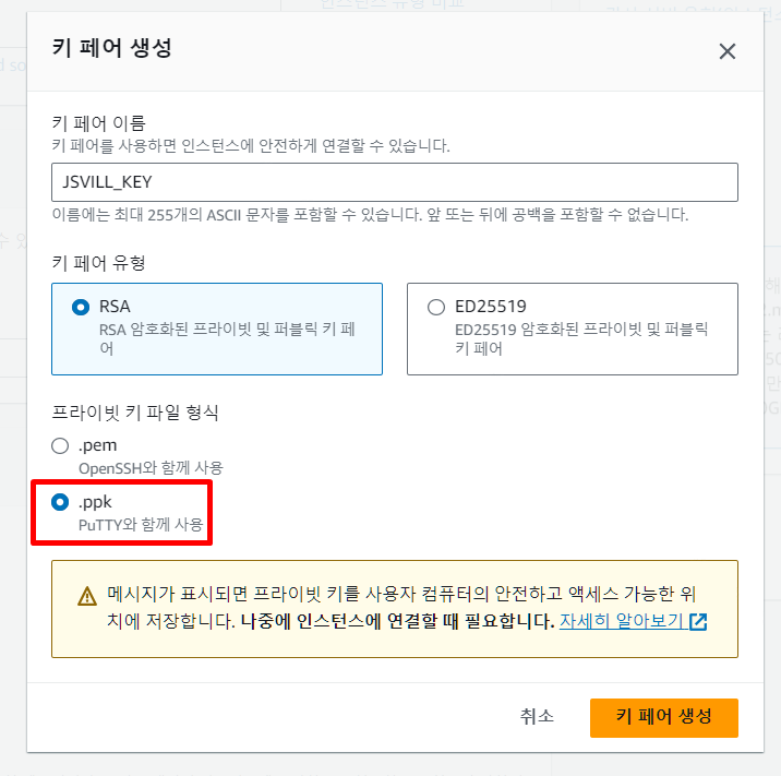 요번엔 바로 PPK파일로 생성하려고 한다.